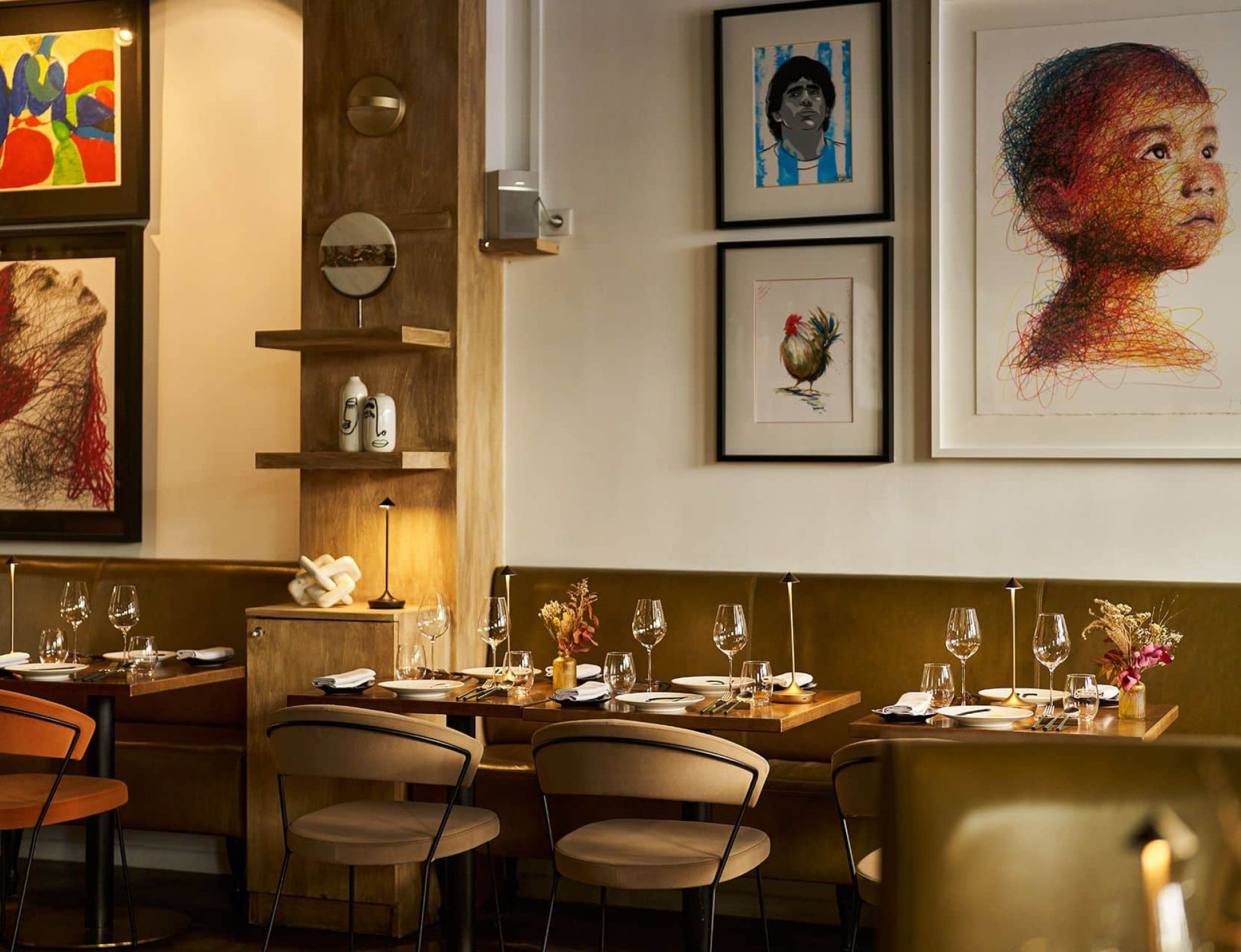C’est justement à New York qu’il comprend que la grande cuisine peut être cool. Qu’elle peut se déguster sans nappes, sans dorures, sans ce ballet de quatre fourchettes devant lesquelles Jack panique dans Titanic – et soyons honnêtes, il n’est clairement pas le seul. Exit la moquette épaisse et le dress code “dalle de La Défense”, exit le silence religieux, les salles figées et le cérémonial intimidant. Place à des lieux qui disent : venez comme vous êtes. Ici, matériaux bruts, art ultra contemporain, grande banquette partagée, ambiance chaleureuse et BO hip-hop accompagnent un menu déjeuner en trois temps à 49 €.