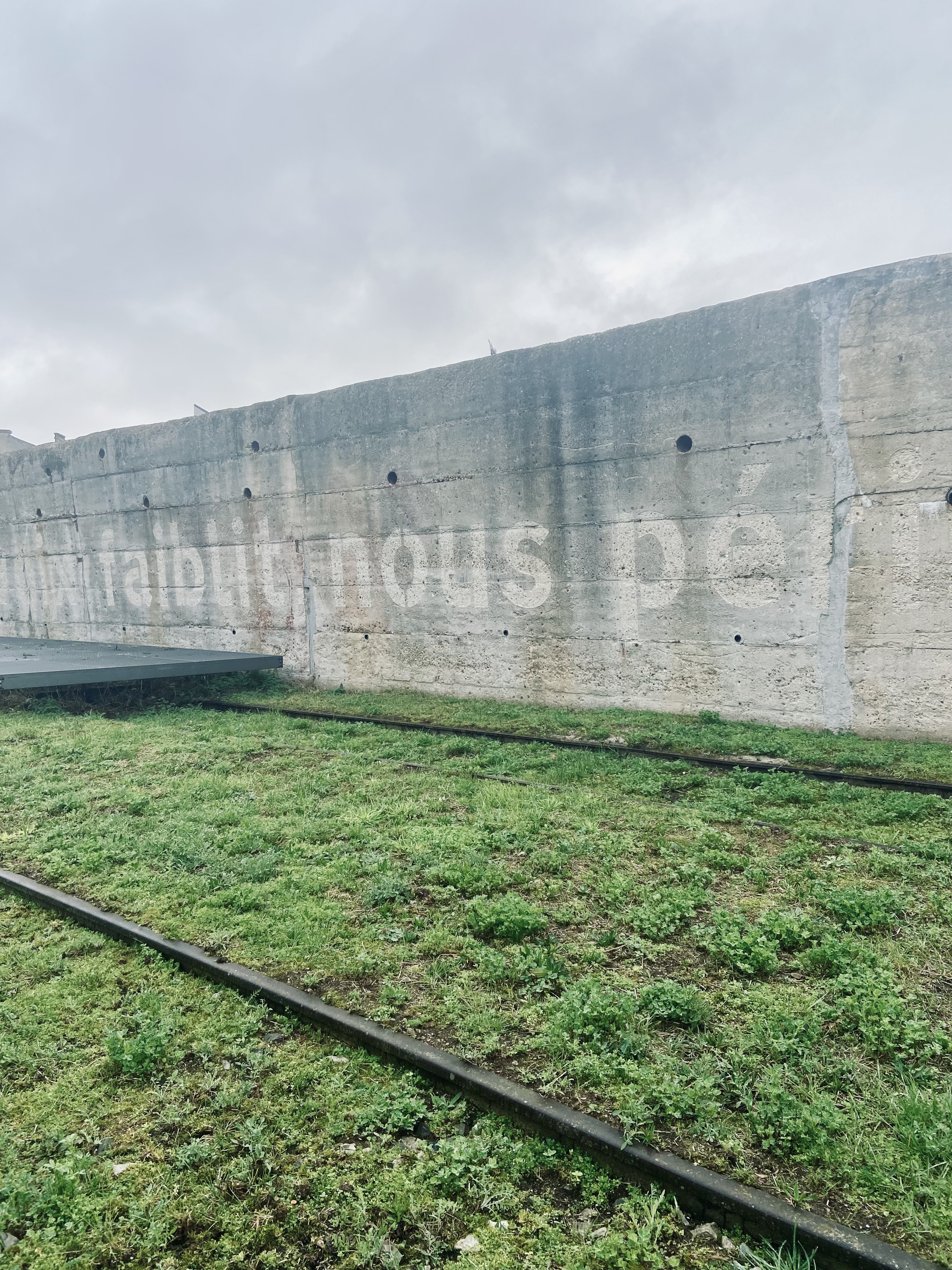 On s’arrête devant la phrase gravée sur un mur, à l’entrée du site. Ari la cite de mémoire, et la mémoire déforme légèrement. « Une bouche qui pliait, comme vous. » Le texte dit priait. Je ne le corrige pas. C’est la Préface en prose de L’Exode, écrite en 1942 par Benjamin Fondane, poète juif roumain arrivé à Paris en 1923, déporté depuis cette gare sur le convoi 75 en mai 1944, mort à Auschwitz en octobre. Il écrivait depuis Bobigny : « un jour viendra, c’est sûr, de la soif apaisée, nous serons au-delà du souvenir, la mort aura parachevé les travaux de la haine, je serai un bouquet d’orties sous vos pieds. Alors, eh bien, sachez que j’avais un visage comme vous. »