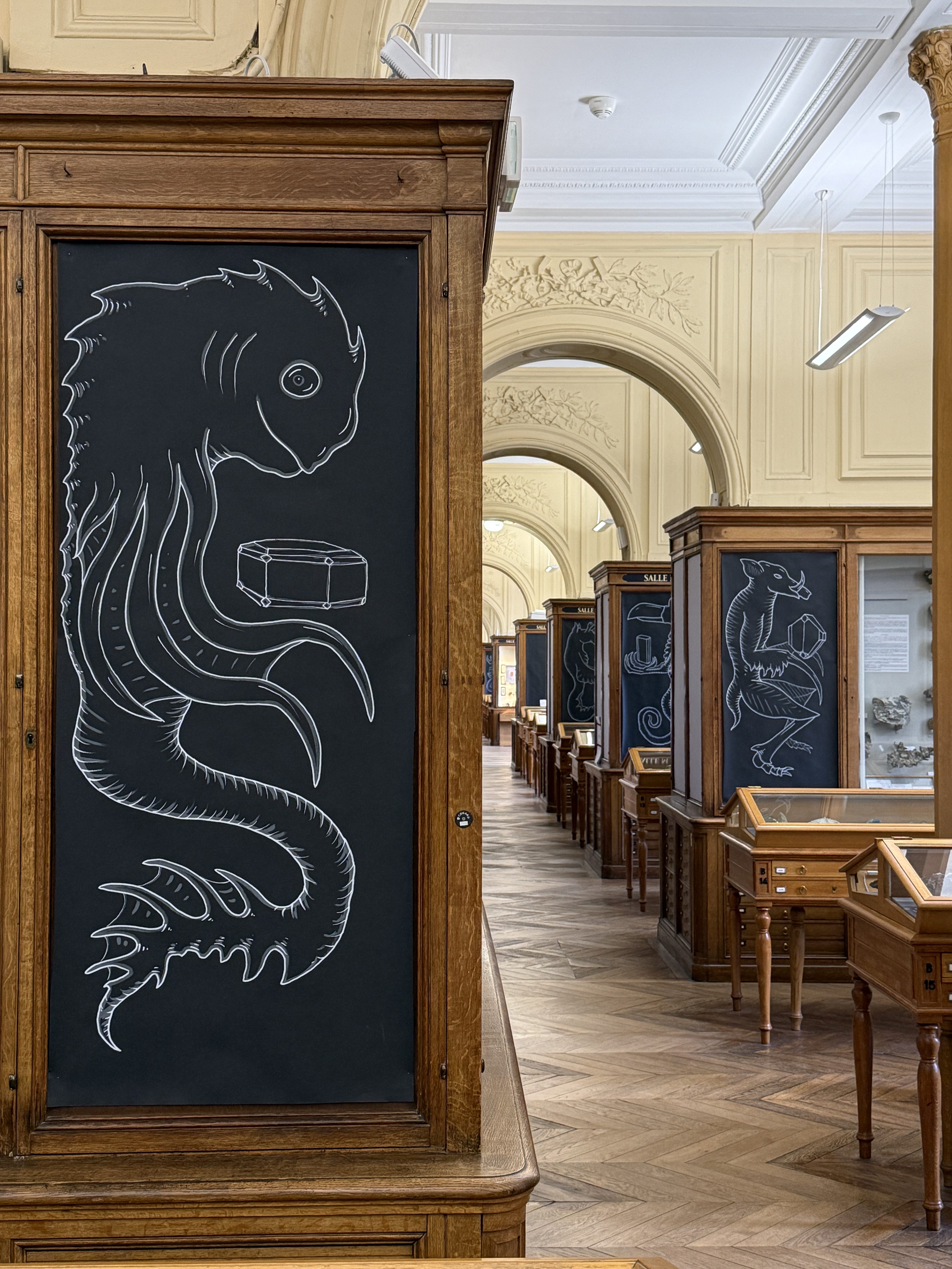 Sur place, Éloïse Gaillou, conservatrice du musée et gemmologue, met aussi la main à la pâte en accrochant elle-même certains panneaux noirs sur lesquels dessine ensuite Codex, dans une ambiance très conviviale, pressée par le vernissage, mais qui fait sentir qu’on a affaire à un véritable musée de passionnés. Dans les vitrines, le niveau de précision prend une autre tournure grâce à des agates dénichées par Romain Bolzoni, conservateur adjoint, qui a permis à Codex de dessiner directement sur des pierres. Cette réalisation sur les objets mêmes se retrouve à d’autres moments de l’exposition, notamment sur des tableaux, mais surtout sur des gravures de cristaux du XVIIIe siècle, sur lesquels se trouvent désormais de petits monstres flashy.