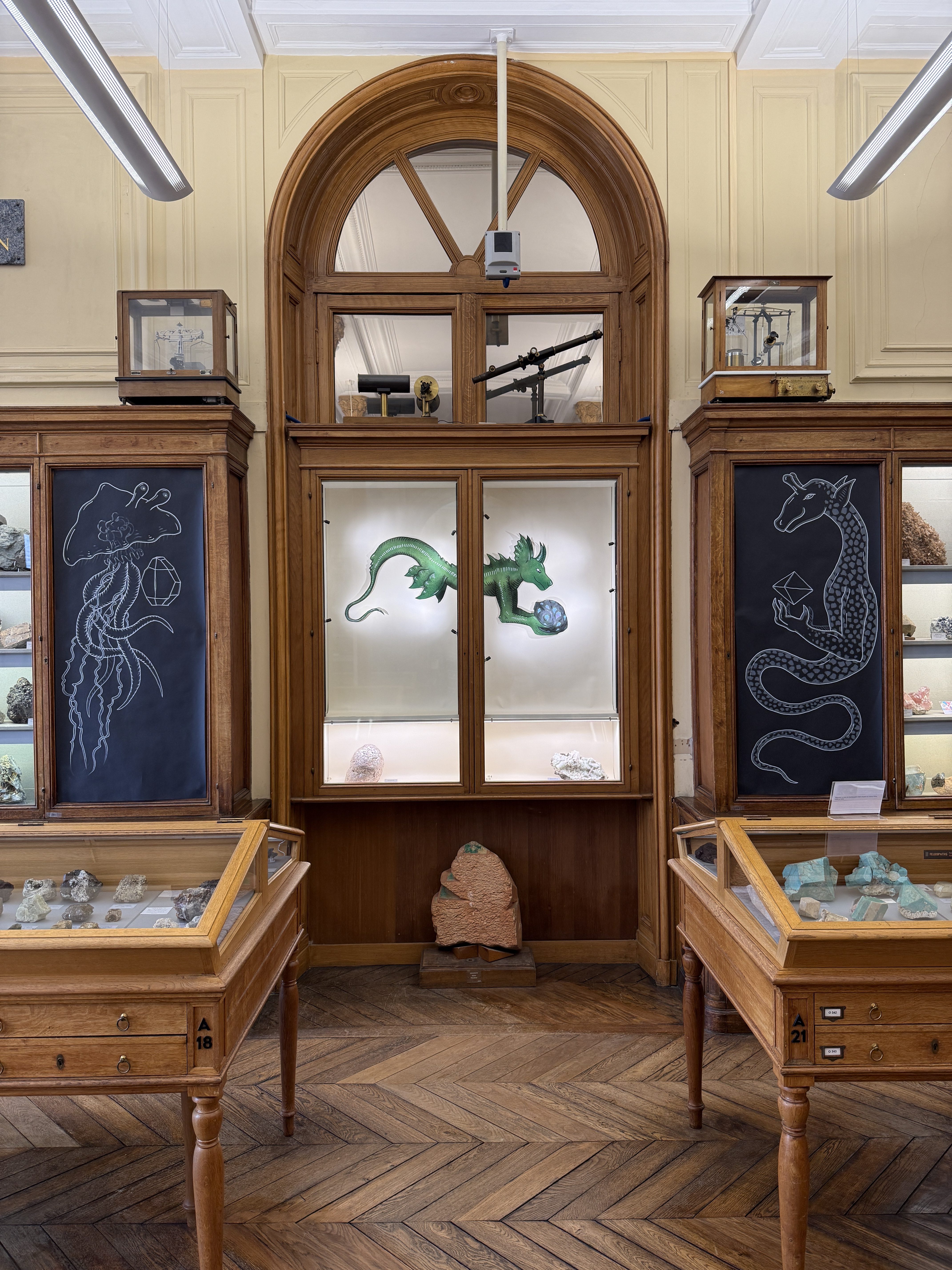 Sur place, les animaux de Codex se fondent parfaitement dans l’architecture historique de la salle d’exposition et ses vitrines aux pierres paraissant venir d’une galaxie lointaine, donnant à la collection une dimension fantastique façon Terre du Milieu, sauce Donjons et Dragons. Les bêtes, invitées des lieux, ne font qu’un avec la collection exceptionnelle du musée de la minéralogie, où l’on trouve notamment une météorite, des pierres fluorescentes ou encore des kimberlites, azurites et pyrites à n’en plus finir.