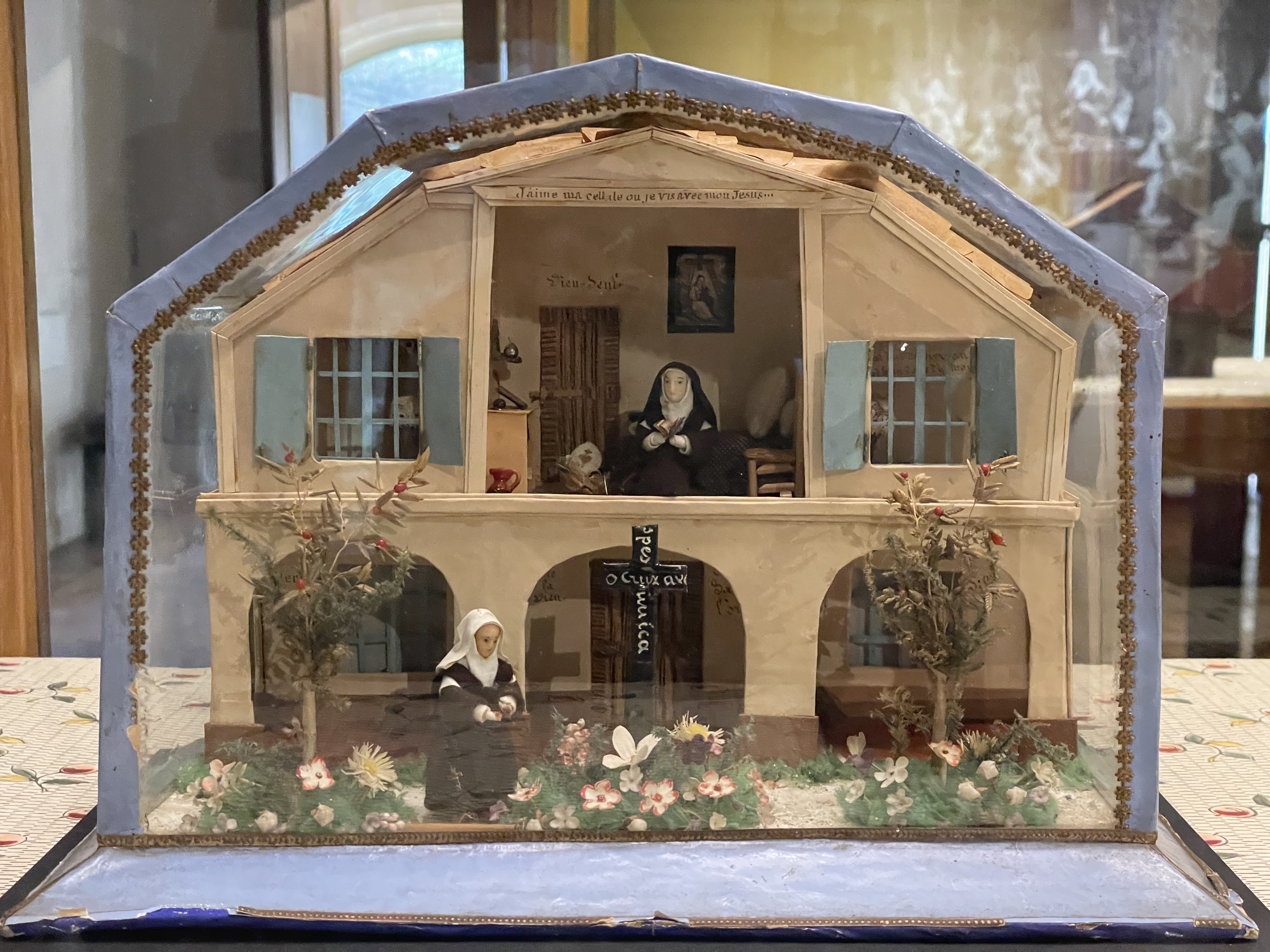 Pour gagner la salle où se tient « Dévoiler », il faut longer un cloître. Au-dessus des portes, des phrases comme autant de viatiques rythmant la vie des sœurs. Et nous voici face à d’étonnantes miniatures : des modèles réduits de leurs cellules fabriqués par les religieuses elles-mêmes. Entre le XVIIIe siècle et la fin des années 60, ces réalisations étaient assez courantes dans les ordres féminins contemplatifs — carmélites déchaussées, franciscaines, bernardines. Les sœurs les envoyaient à leur famille afin que celle-ci puisse se représenter leur vie de prière et de clôture.