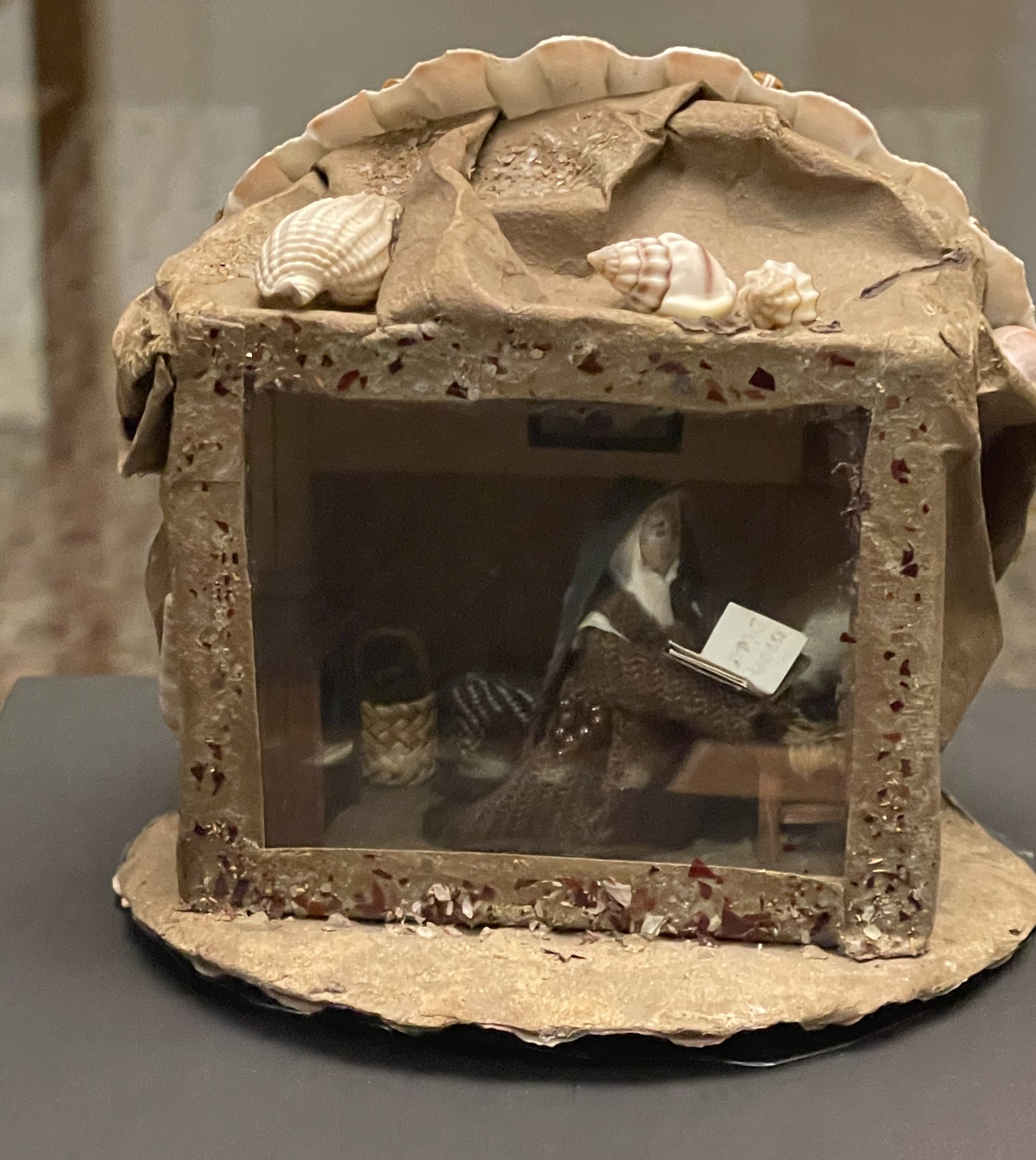 En déambulant au milieu des vitrines, on est frappé par la diversité des modèles : ici, une sœur a reproduit son couvent en miniature. Là, une autre a représenté sa cellule dans une coquille de noix. Certaines réalisations relèvent de la gageure, comme ces cellules reconstituées à l’intérieur d’œufs de cane ou de poule. On se penche pour distinguer, dans un espace de quelques centimètres, un lit minuscule, un prie-Dieu, une table de travail — le tout façonné avec des bouts de tissu, des fragments de papier peint, des brindilles assemblées en mobilier. L’économie de moyens impressionne autant qu’elle émeut : ces femmes cloîtrées reconstituaient leur univers déjà dépouillé dans des contenants plus minuscules encore, comme une mise en abyme de l’essentiel. L’exposition présente même un nécessaire utilisé pour la fabrication de ces modèles réduits : mini-barreaux de chaise, affichettes destinées à orner les murs de ces dioramas.