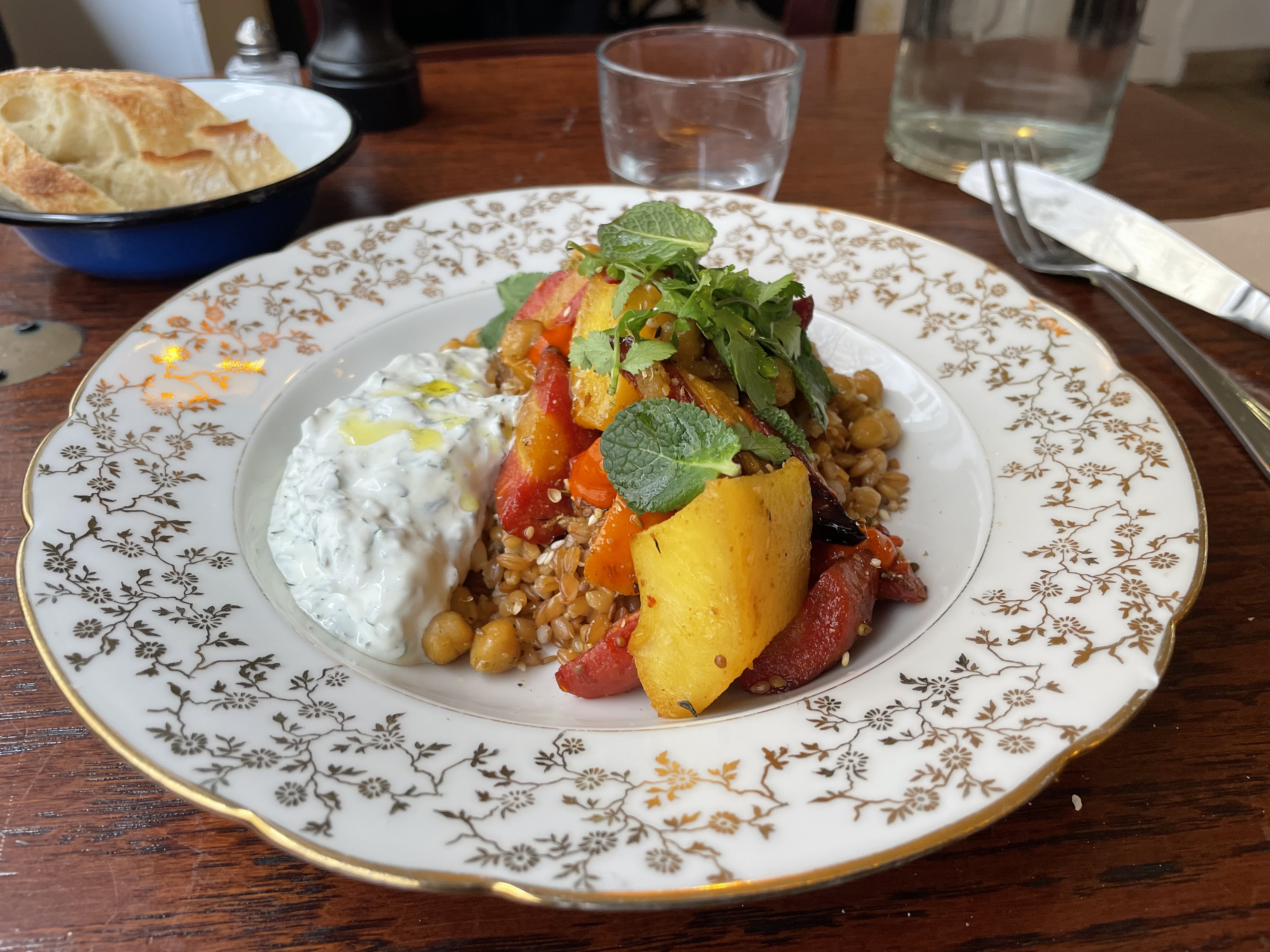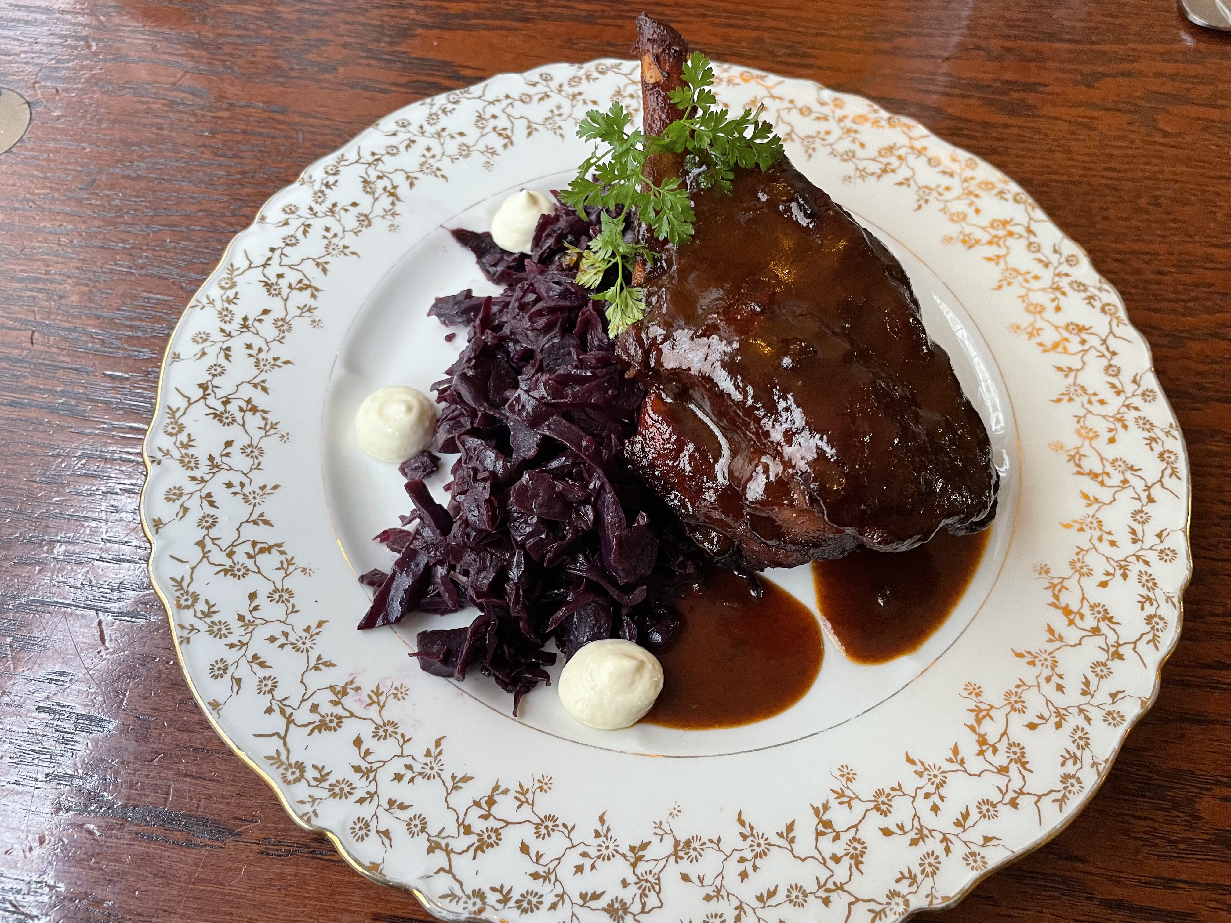 Ce jour-là, on cède à l’appel d’œufs agrémentés d’une mayonnaise aux poireaux. Le croquant est assuré par des croûtons crousti-fondants, et le pain nous permet de ratisser allègrement cette mayo joliment herbacée. Même si le plat végé nous tentait, c’est l’appel du travers de porc qui a été le plus fort. Laqué, il est accompagné d’une compotée de chou rouge au raifort. Un bon plat d’hiver, généreusement servi, qui nous fait faire l’impasse sur le dessert — même si on laisse à regret l’œuf à la neige. On reviendra.