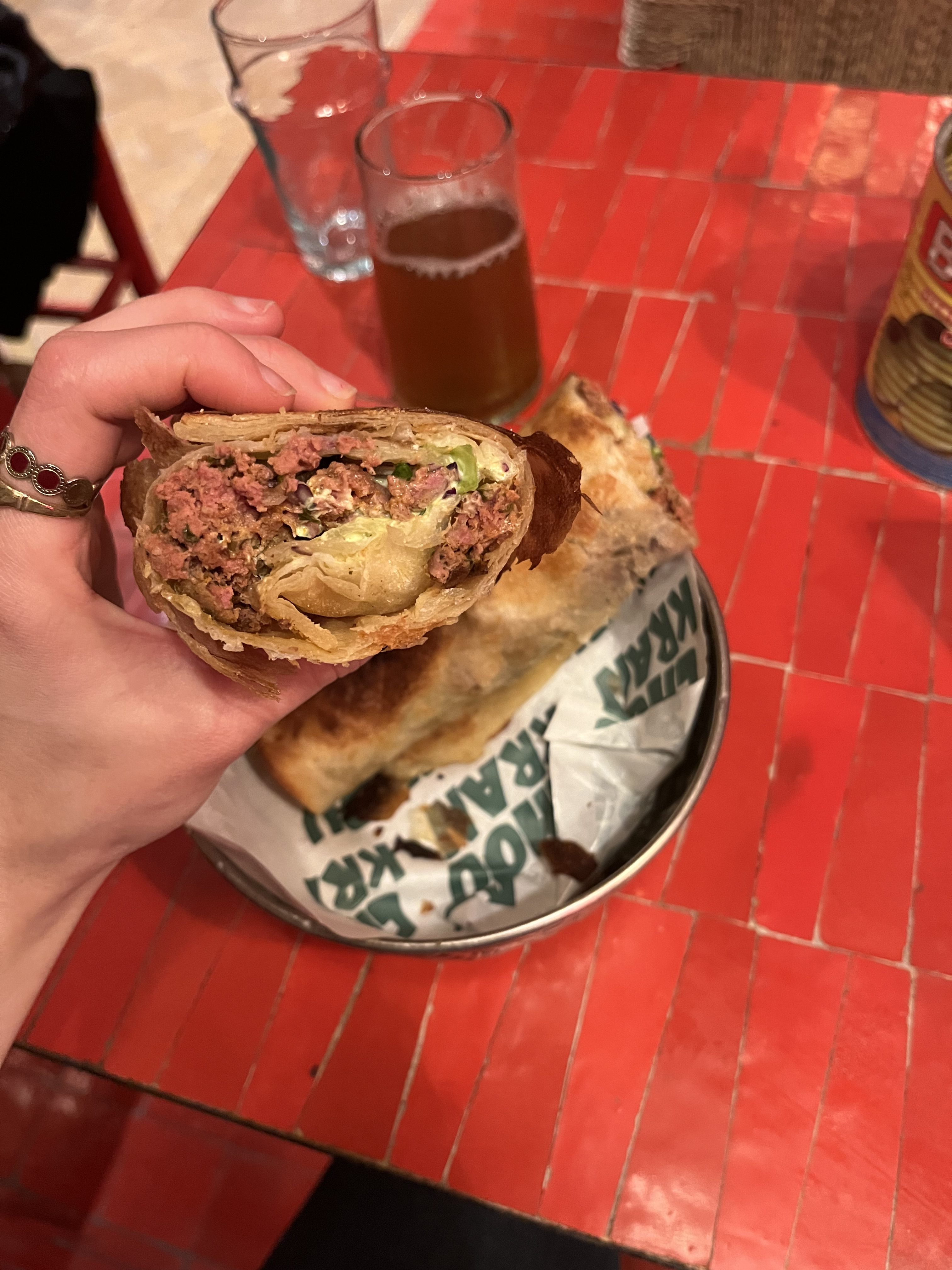 À peine le temps de me laisser aller à la contemplation qu’on m’apporte ma commande. À savoir un « kazdal », un sandwich à base de msemmen (crêpes feuilletées du Maghreb) toastées, fourrées de crudités, de kefta, et de légumes marinés.